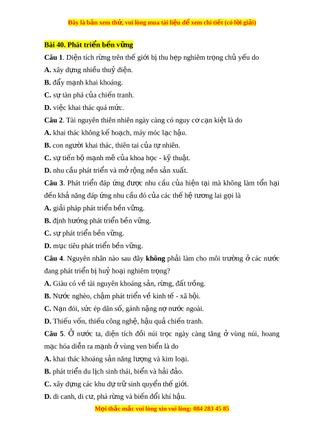 Đây là bản xem th , vu ử i lòng mua tài li u ệ đ xe ể m chi ti t ế (có l i ờ gi i ả ) Bài 40. Phát tri n b ể n v ề ng ữ Câu 1. Di n t ệ ích r ng t ừ rên th gi ế i ớ b t ị hu h p nghi ẹ êm tr ng ch ọ y ủ u do ế A. xây d ng nhi ự u t ề hu đi ỷ ện. B. đẩy m nh khai ạ khoáng. C. s t ự àn phá c a chi ủ n t ế ranh.