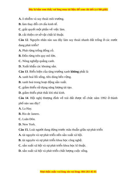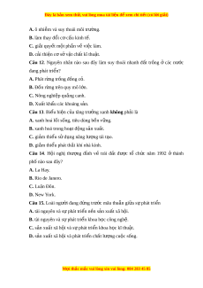 A. xanh hoá lối sống, tiêu dùng b n v ề ng. ữ B. xanh hoá trong ho t ạ đ ng s ộ n ả xu t ấ . C. gi m ả thi u s ể ử d ng năng l ụ ư ng t ợ ái t o. ạ D. gi m ả thi u phát ể th i ả khí nhà kính. Câu 14. H i ộ nghị thư ng ợ đ nh ỉ về trái đ t ấ đư c ợ tổ ch c ứ năm 1992 ở thành phố nào sau đây? A. La Hay. B. Rio de Janero. C. Luân Đôn. D. New York. Câu 15. Loài ngư i ờ đang đ ng ứ trư c ớ mâu thu n gi ẫ a ữ s phát ự tri n ể
