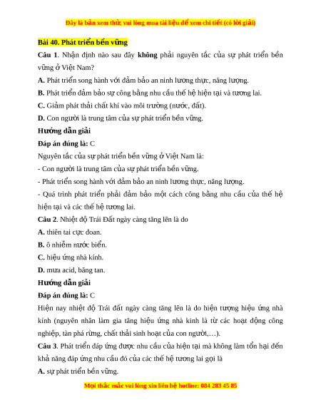ị nào sau đây không ph i ả nguyên t c ắ c a ủ sự phát tri n ể b n ề v ng ữ ở Vi t ệ Nam? A. Phát tri n s ể ong hành v i ớ đ m ả b o ả an ninh lư ng t ơ h c, năng l ự ư ng. ợ B. Phát tri n đ ể m ả b o s ả ự công b ng ằ nhu c u t ầ h h ế hi ệ n t ệ i ạ và tư ng l ơ ai. C. Gi m ả phát th i ả ch t ấ khí vào môi trư ng ờ (nư c, ớ đ t ấ ). D. Con ngư i ờ là trung tâm c a s ủ ự phát tri n b ể n ề v ng. ữ Hư ng d ớ ẫn gi i ả Đáp án đúng là: C Nguyên t c c ắ a ủ s phát ự tri n b ể n v ề ng ữ ở Vi t ệ Nam là: - Con ngư i ờ là trung tâm c a ủ s phát ự tri n b ể n v ề ng. ữ - Phát tri n s ể ong hành v i ớ đ m ả b o an ni ả nh lư ng ơ th c, ự năng lư ng. ợ - Quá trình phát tri n ể ph i ả đ m ả b o ả m t ộ cách công b ng ằ nhu c u ầ c a ủ thế hệ hiện t i ạ và các th h ế t ệ ư ng l ơ ai. Câu 2. Nhi t ệ đ ộ Trái Đ t