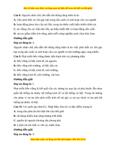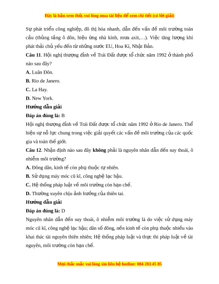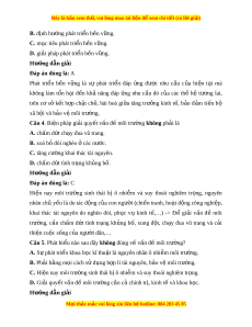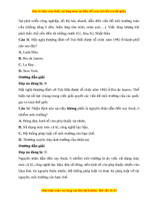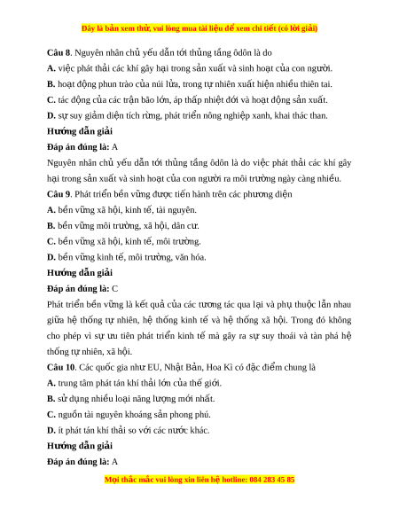 Câu 8. Nguyên nhân ch y ủ u d ế n t ẫ i ớ th ng t ủ ng ôdôn l ầ à do A. việc phát th i ả các khí gây h i ạ trong s n xu ả t ấ và sinh ho t ạ c a con ng ủ ư i ờ . B. ho t ạ đ ng phun t ộ rào c a ủ núi l a, t ử rong t nhi ự ên xu t ấ hi n nhi ệ u t ề hiên tai. C. tác đ ng c ộ a các ủ tr n ậ bão l n, áp t ớ h p nhi ấ t ệ đ i ớ và ho t ạ đ ng ộ s n ả xu t ấ . D. sự suy gi m ả diện tích r ng, phát ừ tri n nông nghi ể p xanh, khai ệ thác than. Hư ng d ớ ẫn gi i ả Đáp án đúng là: A Nguyên nhân chủ y u ế d n ẫ t i ớ th ng ủ t ng ầ ôdôn là do vi c ệ phát th i ả các khí gây h i ạ trong s n xu ả t ấ và sinh ho t ạ c a con ủ ngư i ờ ra môi trư ng ngày ờ càng nhi u. ề Câu 9. Phát tri n b ể n v ề ng đ ữ ư c ợ ti n hành t ế rên các phư ng di ơ n ệ A. b n v ề ng ữ xã h i ộ , kinh t , t ế ài nguyên. B. b n v ề ng m ữ ôi trư ng, ờ xã h i ộ , dân c . ư C. b n v ề ng ữ xã h i ộ , kinh t , m ế ôi trư ng. ờ D. b n v ề ng ữ kinh t , m ế ôi trư ng, văn ờ hóa. Hư ng d ớ ẫn gi i ả Đáp án đúng là: C Phát tri n ể b n ề v ng ữ là k t ế qu ả c a ủ các tư ng ơ tác qua l i ạ và ph ụ thu c ộ l n ẫ nhau gi a ữ hệ th ng ố tự nhiên, hệ th ng ố kinh tế và hệ th ng ố xã h i ộ . Trong đó không cho phép vì sự u ư tiên phát tri n