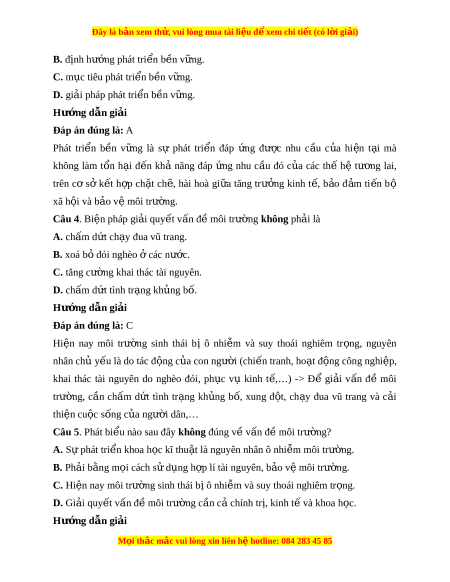 Đây là bản xem th , vu ử i lòng mua tài li u ệ đ xe ể m chi ti t (c ế ó l i ờ gi i ả ) B. định hư ng phát ớ tri n ể b n v ề ng. ữ C. m c ụ tiêu phát tri n b ể n v ề ng. ữ D. gi i ả pháp phát tri n b ể n ề v ng. ữ Hư ng d ớ ẫn gi i ả Đáp án đúng là: A Phát tri n ể b n ề v ng ữ là sự phát tri n ể đáp ng ứ đư c ợ nhu c u ầ c a ủ hi n ệ t i ạ mà không làm t n ổ h i ạ đ n ế khả năng đáp ng ứ nhu c u ầ đó c a ủ các thế hệ tư ng ơ lai, trên cơ sở k t ế h p ợ ch t ặ ch , ẽ hài hoà gi a ữ tăng trư ng ở kinh t , ế b o ả đ m ả ti n ế bộ xã h i ộ và b o v ả ệ môi trư ng. ờ