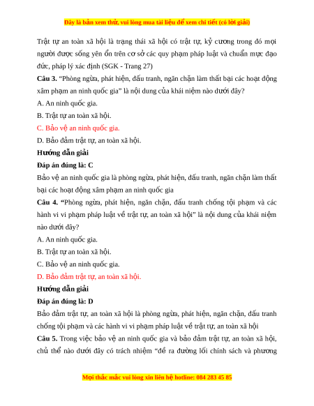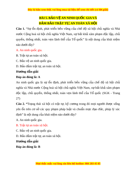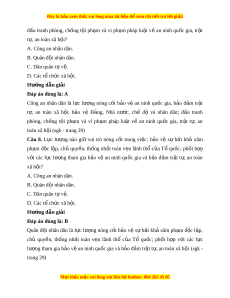 Câu 1. “Sự ổn đ nh, ị phát tri n ể b n ề v ng ữ c a ủ chế độ xã h i ộ chủ nghĩa và Nhà nư c ớ C ng ộ hoà xã h i ộ ch ủ nghĩa Vi t ệ Nam, s ự b t ấ kh ả xâm ph m ạ đ c ộ l p, ậ chủ quy n, ề th ng ố nh t ấ , toàn v n ẹ lãnh thổ c a ủ Tổ qu c” ố là n i ộ dung c a ủ khái ni m ệ nào dư i ớ đây? A. An ninh quốc gia. B. Tr t ậ t an t ự oàn xã h i ộ . C. B o ả v an ệ ninh qu c gi ố a. D. B o đ ả m ả tr t ậ t , an t ự oàn xã h i ộ . Hư ng d ớ ẫn gi i ả Đáp án đúng là: A An ninh qu c ố gia là sự ổn đ nh, ị phát tri n ể b n ề v ng ữ c a ủ chế độ xã h i ộ chủ nghĩa và Nhà nư c ớ C ng ộ hoà xã h i ộ ch ủ nghĩa Vi t ệ Nam, s ự b t ấ kh ả xâm ph m ạ đ c ộ l p, ậ chủ quy n, ề th ng ố nh t ấ , toàn v n ẹ lãnh thổ c a ủ Tổ qu c ố (SGK - Trang 27) Câu 2. “Tr ng ạ thái xã h i ộ có tr t ậ t , ự kỷ cư ng ơ trong đó m i ọ ngư i ờ đư c ợ s ng ố