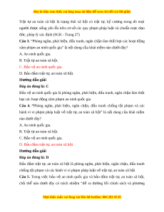 ạ an ninh quốc gia” là n i ộ dung c a ủ khái ni m ệ nào dư i ớ đây? A. An ninh quốc gia. B. Tr t ậ t an t ự oàn xã h i ộ . C. B o ả v an ệ ninh qu c gi ố a. D. B o đ ả m ả tr t ậ t , an t ự oàn xã h i ộ . Hư ng d ớ ẫn gi i ả Đáp án đúng là: C B o ả v an ệ ninh qu c gi ố a là phòng ng a, ừ phát hi n, ệ đ u t ấ ranh, ngăn ch n ặ làm th t ấ b i ạ các ho t ạ đ ng xâm ộ ph m ạ an ninh qu c gi ố a Câu 4. “Phòng ng a, ừ phát hi n, ệ ngăn ch n, ặ đ u ấ tranh ch ng ố t i ộ ph m ạ và các hành vi vi ph m ạ pháp lu t ậ về tr t ậ t , ự an toàn xã h i ộ ” là n i ộ dung c a ủ khái ni m ệ nào dư i ớ đây? A. An ninh quốc gia. B. Tr t ậ t an t ự oàn xã h i ộ . C. B o ả v an ệ ninh qu c gi ố a. D. B o đ ả m ả tr t ậ t , an t ự oàn xã h i ộ . Hư ng d ớ ẫn gi i ả Đáp án đúng là: D B o ả đ m ả tr t ậ t , ự an toàn xã h i ộ là phòng ng a, ừ phát hi n, ệ ngăn ch n, ặ đ u ấ tranh chống t i ộ ph m ạ và các hành vi vi ph m ạ pháp lu t ậ v t ề r t ậ t , an ự toàn xã h i ộ Câu 5. Trong vi c ệ b o ả vệ an ninh qu c ố gia và b o ả đ m ả tr t ậ t , ự an toàn xã h i ộ , chủ thể nào dư i ớ đây có trách nhi m ệ “đề ra đư ng ờ l i ố chính sách và phư ng ơ M i