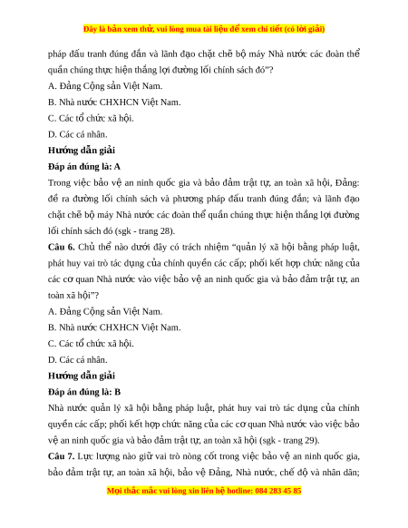 Đây là bản xem th , vu ử i lòng mua tài li u ệ đ xe ể m chi ti t (c ế ó l i ờ gi i ả ) pháp đ u ấ tranh đúng đ n ắ và lãnh đ o ạ ch t ặ chẽ bộ máy Nhà nư c ớ các đoàn thể quần chúng th c hi ự n t ệ h ng ắ l i ợ đư ng l ờ i ố chính sách đó”? A. Đ ng ả C ng ộ s n ả Vi t ệ Nam. B. Nhà nư c ớ CHXHCN Vi t ệ Nam. C. Các tổ ch c ứ xã h i ộ . D. Các cá nhân. Hư ng d ớ ẫn gi i ả Đáp án đúng là: A Trong vi c ệ b o ả vệ an ninh qu c ố gia và b o ả đ m ả tr t ậ t , ự an toàn xã h i ộ , Đ ng: ả đề ra đư ng ờ l i ố chính sách và phư ng ơ pháp đ u ấ tranh đúng đ n; ắ và lãnh đ o ạ ch t ặ chẽ bộ máy Nhà nư c ớ các đoàn th ể qu n ầ chúng th c ự hi n ệ th ng ắ l i ợ đư ng ờ