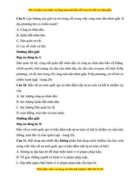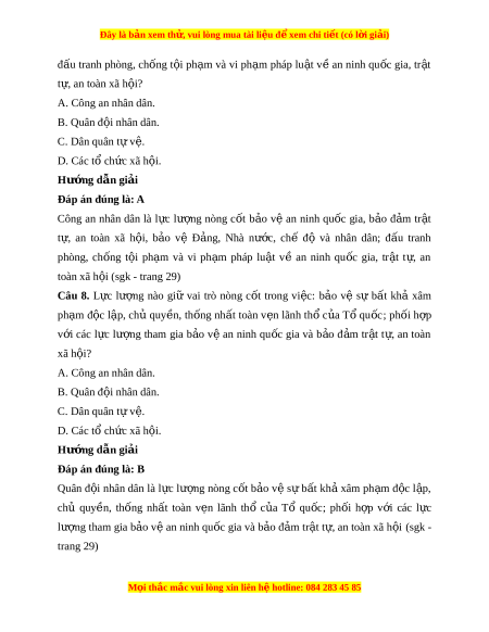Đây là bản xem th , vu ử i lòng mua tài li u ệ đ xe ể m chi ti t (c ế ó l i ờ gi i ả ) đấu tranh phòng, ch ng ố t i ộ ph m ạ và vi ph m ạ pháp lu t ậ v ề an ninh qu c ố gia, tr t ậ t , an ự toàn xã h i ộ ? A. Công an nhân dân. B. Quân đ i ộ nhân dân. C. Dân quân t v ự . ệ D. Các tổ ch c xã h ứ i ộ . Hư ng d ớ ẫn gi i ả Đáp án đúng là: A Công an nhân dân là l c ự lư ng ợ nòng c t ố b o ả vệ an ninh qu c ố gia, b o ả đ m ả tr t ậ t , ự an toàn xã h i ộ , b o ả vệ Đ ng, ả Nhà nư c,