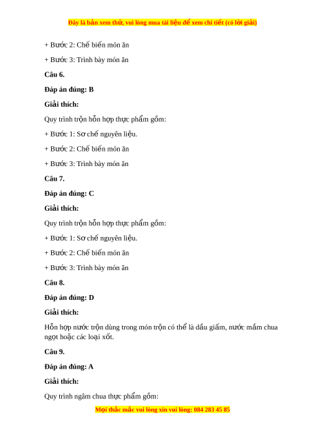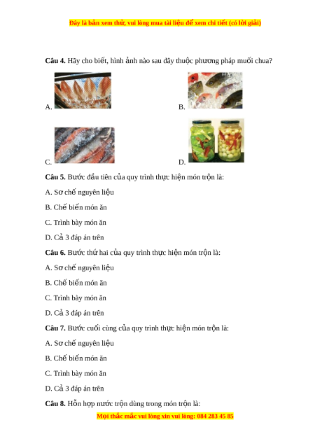 Đây là bản xem th , vu ử i lòng mua tài li u ệ đ xe ể m chi ti t ế (có l i ờ gi i ả ) Câu 4. Hãy cho bi t ế , hình nh ả nào sau đây thu c ph ộ ư ng pháp ơ mu i ố chua? A. B. C. D. Câu 5. Bư c ớ đ u t ầ iên c a ủ quy trình th c hi ự n m ệ ón tr n l ộ à: A. S ch ơ nguyên l ế i u ệ B. Chế bi n m ế ón ăn C. Trình bày món ăn D. Cả 3 đáp án trên Câu 6. Bư c ớ th hai ứ c a ủ quy trình th c hi ự n m ệ ón tr n l ộ à: A. S ch ơ nguyên l ế i u ệ B. Chế bi n m ế ón ăn C. Trình bày món ăn D. Cả 3 đáp án trên Câu 7. Bư c ớ cuối cùng c a ủ quy trình th c hi ự n m ệ ón tr n l ộ à: A. S ch ơ nguyên l ế i u ệ B. Chế bi n m ế ón ăn C. Trình bày món ăn D. Cả 3 đáp án trên Câu 8. Hỗn h p n ợ ư c t ớ r n dùng t ộ rong món tr n l ộ à: M i