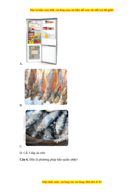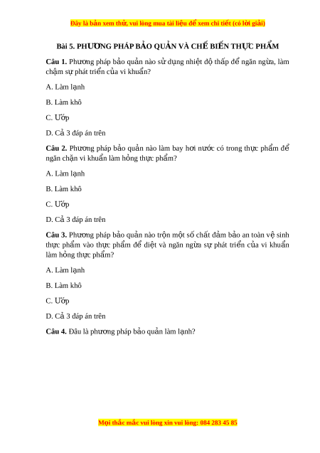 Đây là bản xem th , vu ử i lòng mua tài li u ệ đ xe ể m chi ti t ế (có l i ờ gi i ả ) Bài 5. PHƯ N Ơ G PHÁP B O Ả QU N Ả VÀ CH B Ế I N Ế TH C Ự PH M Ẩ Câu 1. Phư ng ơ pháp b o ả qu n ả nào s ử d ng ụ nhi t ệ đ ộ th p ấ đ ể ngăn ng a, ừ làm ch m ậ s phát ự tri n c ể a vi ủ khuẩn? A. Làm l nh ạ B. Làm khô C. p Ướ D. Cả 3 đáp án trên Câu 2. Phư ng ơ pháp b o ả qu n ả nào làm bay h i ơ nư c ớ có trong th c ự ph m ẩ để ngăn ch n ặ vi khuẩn làm h ng ỏ th c ự ph m ẩ ? A. Làm l nh ạ B. Làm khô C. p Ướ D. Cả 3 đáp án trên Câu 3. Phư ng ơ pháp b o ả qu n ả nào tr n ộ m t ộ s ố ch t ấ đ m ả b o ả an toàn v ệ sinh th c ự ph m ẩ vào th c ự ph m ẩ để di t ệ và ngăn ng a ừ sự phát tri n ể c a ủ vi khu n ẩ làm h ng t ỏ h c ph ự m ẩ ? A. Làm l nh ạ B. Làm khô C. p Ướ D. Cả 3 đáp án trên