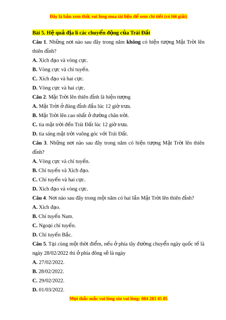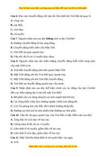 Đây là bản xem th , vu ử i lòng mua tài li u ệ đ xe ể m chi ti t (c ế ó l i ờ gi i ả ) Câu 6. Khu v c ự chuy n đ ể ng v ộ i ớ v n ậ t c l ố n nh ớ t ấ khi Trái Đ t ấ t quay l ự à A. vòng c c. ự B. c c B ự c. ắ C. xích đ o. ạ D. chí tuy n. ế