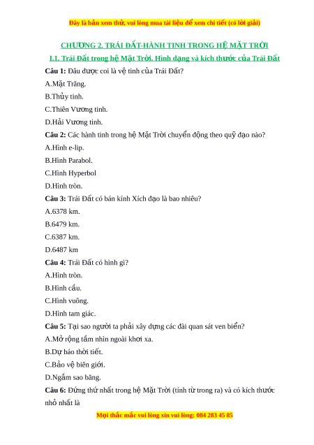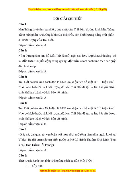 Đây là bản xem th , vu ử i lòng mua tài li u ệ đ xe ể m chi ti t ế (có l i ờ gi i ả ) L I Ờ GIẢI CHI TI T Ế Câu 1: M t ặ Trăng là vệ tinh t nhi ự ên, duy nh t ấ c a ủ Trái Đ t ấ , đư ng ờ kính M t ặ Trăng b ng m ằ t ộ phần t đ ư ư ng ờ kính c a ủ Trái Đ t ấ , còn kh i ố lư ng ợ b ng m ằ t ộ ph n ầ 81 khối lư ng ợ c a ủ Trái Đ t ấ . Đáp án cần ch n ọ là: A Câu 2: N m ằ ở trung tâm c a ủ h M ệ t ặ Tr i ờ là m t ộ ngôi sao l n, t ớ phát ự ra ánh sáng- đó là M t ặ Tr i ờ . Chuy n đ ể ng xung quang ộ M t ặ Tr i