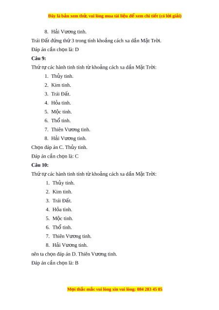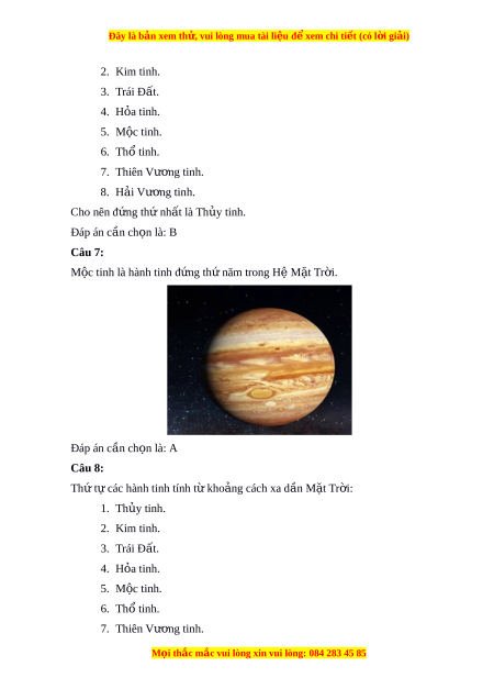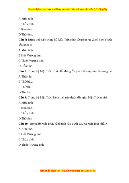 Đây là bản xem th , vu ử i lòng mua tài li u ệ đ xe ể m chi ti t ế (có l i ờ gi i ả ) 2. Kim tinh. 3. Trái Đất. 4. H a t ỏ inh. 5. M c ộ tinh. 6. Thổ tinh. 7. Thiên Vư ng t ơ inh. 8. H i ả Vư ng t ơ inh. Cho nên đ ng ứ thứ nh t ấ là Th y ủ tinh. Đáp án cần ch n ọ là: B Câu 7: M c