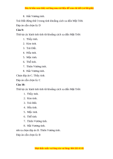 ừ rong ra) và có kích thư c ớ l n nh ớ ất là A.M c ộ tinh. B.H i ả Vư ng ơ tinh. C.Thiên Vư ng ơ tinh. D.H a t ỏ inh. Câu 8: Trong hệ M t ặ Tr i ờ , Trái Đất đ ng ứ v ở t ị rí th m ứ y t ấ ính t t ừ rong ra? A.Th s ứ áu B.Th b ứ y ả . C.Th t ứ . ư D.Th ba ứ Câu 9: Trong hệ M t ặ Tr i ờ , hành tinh nào dư i ớ đây gần M t ặ Tr i ờ nh t ấ ? A.M c ộ tinh B.Kim tinh. C.Th y t ủ inh D.Thổ tinh Câu 10: Trong hệ M t ặ Tr i ờ , hành tinh nào dư i ớ đây xa M t ặ Tr i ờ nhất? A.Kim tinh. B.H i ả Vư ng ơ tinh. C.Th y t ủ inh. D.Thiên Vư ng t ơ inh. M i