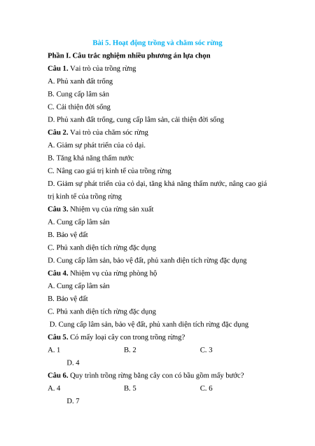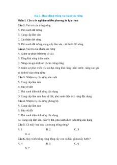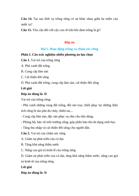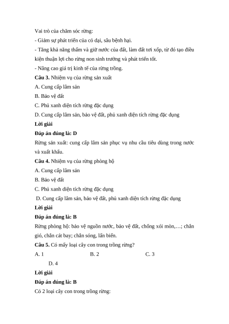 Câu 1. Vai trò của trồng rừng A. Phủ xanh đất trống B. Cung cấp lâm sản C. Cải thiện đời sống