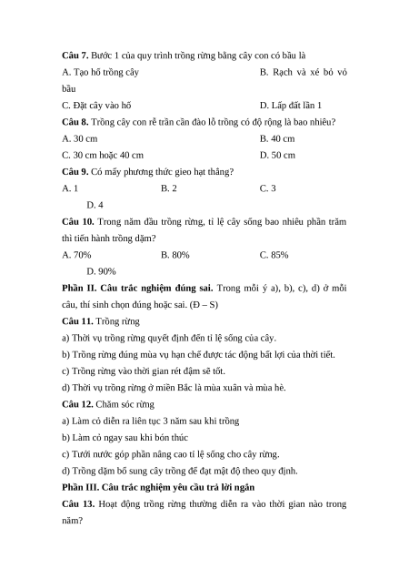 câu, thí sinh chọn đúng hoặc sai. (Đ – S) Câu 11. Trồng rừng