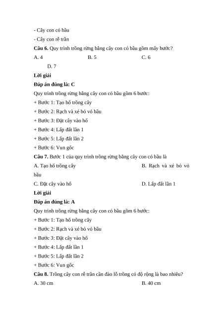 Câu 6. Quy trình trồng rừng bằng cây con có bầu gồm mấy bước? A. 4 B. 5 C. 6 D. 7