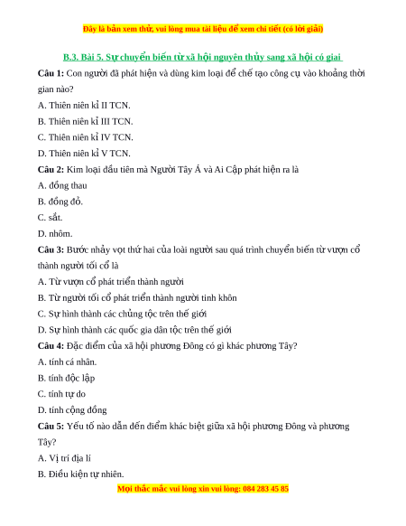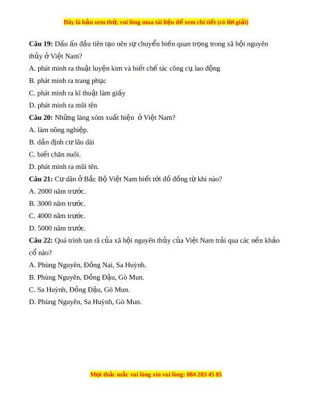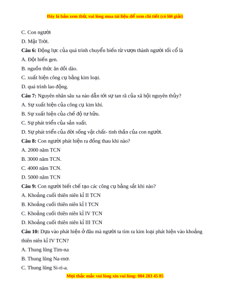 Câu 7: Nguyên nhân sâu xa nào dẫn t i ớ sự tan rã c a xã h ủ i ộ nguyên th y? ủ A. S xu ự ất hi n c ệ a công c ủ ụ kim khí. B. S xu ự t ấ hi n c ệ a ủ ch đ ế t ộ h ư u. ữ C. S phát ự tri n c ể a ủ s n ả xu t ấ . D. S phát ự tri n c ể a đ ủ i ờ sống v t ậ ch t ấ - tinh th n c ầ a ủ con ngư i ờ . Câu 8: Con ngư i ờ phát hi n r ệ a đ ng t ồ hau khi nào? A. 2000 năm TCN B. 3000 năm TCN. C. 4000 năm TCN. D. 5000 năm TCN Câu 9: Con ngư i ờ bi t ế ch t ế o các ạ công c b ụ ng ằ s t ắ khi nào? A. Kho ng ả cuối thiên niên k I ỉ I TCN B. Kho ng cu ả ối thiên niên k I ỉ TCN C. Kho ng cu ả ối thiên niên k I ỉ V TCN D. Kho ng ả cuối thiên niên k I ỉ II TCN Câu 10: D a vào phát ự hi n ệ đâu ở mà ngư i ờ ta tìm ra kim lo i ạ phát hi n vào kho ệ ng ả thiên niên k I ỉ V TCN? A. Thung lũng Tim-na B. Thung lũng Na-m . ơ C. Thung lũng Si-ri-a. M i ọ thắc m c