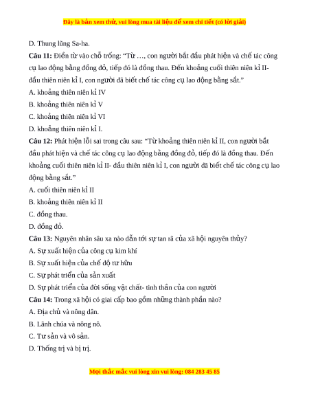 Đây là bản xem th , vu ử i lòng mua tài li u ệ đ xe ể m chi ti t (c ế ó l i ờ gi i ả ) Câu 15: Đi n t ề vào câu ừ sau: “Công c l ụ ao đ ng b ộ ng ằ kim lo i ạ đư c ợ s d ử ng ph ụ ổ bi n không ch ế ỉ tác đ ng t ộ r c ự ti p ế đ n ki ế nh t m ế à còn d n đ ẫ n s ế ự chuy n bi ể n t ế xã ừ h i ộ nguyên th y s ủ ang …” A. xã h i ộ có giai cấp. B. xã h i ộ bị phân hóa. C. xã h i ộ có nhà nước. D. xã h i ộ bị thông trị Câu 16: Nh ng ng ữ ư i ờ đ ng ứ đ u t ầ h t ị c khi ộ xã h i ộ xu t ấ hi n gi ệ ai c p chuy ấ n t ể hành giai cấp nào? A. Giai c p t ấ h ng t ố r . ị B. Địa ch phong ki ủ n. ế C. Lãnh chúa. D. Quý t c. ộ