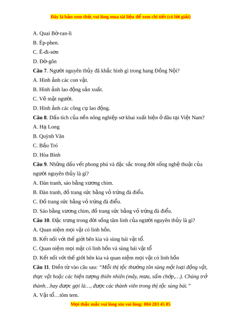 Đây là bản xem th , vu ử i lòng mua tài li u ệ đ xe ể m chi ti t ế (có l i ờ gi i ả ) A. Quai B - ờ ran-li B. Ép-phen. C. Ê-đi-s n ơ D. Đ - ờ gôn Câu 7. Ngư i ờ nguyên th y đã ủ kh c hì ắ nh gì trong hang Đ ng N ồ i ộ ? A. Hình nh các ả con v t ậ . B. Hình nh ả lao đ ng s ộ n xu ả t ấ . C. Vẽ m t ặ ngư i ờ . D. Hình nh các ả công c l ụ ao đ ng. ộ