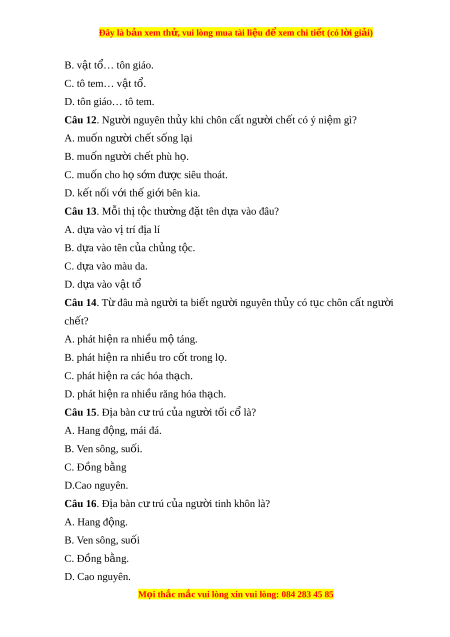 Đây là bản xem th , vu ử i lòng mua tài li u ệ đ xe ể m chi ti t ế (có l i ờ gi i ả ) B. v t ậ tổ… tôn giáo. C. tô tem… v t ậ tổ. D. tôn giáo… tô tem. Câu 12. Ngư i ờ nguyên th y khi ủ chôn c t ấ ngư i ờ ch t ế có ý ni m ệ gì? A. muốn ngư i ờ ch t ế s ng l ố i ạ B. muốn ngư i ờ ch t ế phù h . ọ C. muốn cho h s ọ m ớ đư c ợ siêu thoát. D. k t ế n i ố v i ớ th gi ế i ớ bên kia.