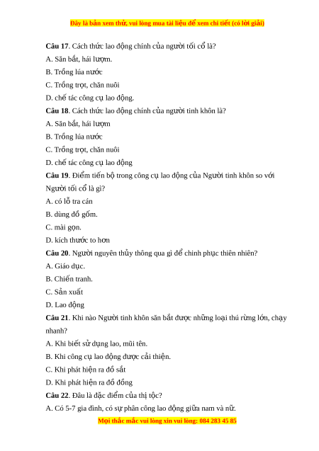 Đây là bản xem th , vu ử i lòng mua tài li u ệ đ xe ể m chi ti t ế (có l i ờ gi i ả ) Câu 17. Cách th c ứ lao đ ng chí ộ nh c a ủ ngư i ờ t i ố c l ổ à? A. Săn b t ắ , hái lư m ợ . B. Trồng lúa nư c ớ C. Trồng tr t ọ , chăn nuôi D. ch t ế ác công c l ụ ao đ ng. ộ Câu 18. Cách th c ứ lao đ ng chí ộ nh c a ủ ngư i ờ tinh khôn là? A. Săn b t ắ , hái lư m ợ B. Trồng lúa nư c ớ C. Trồng tr t ọ , chăn nuôi D. ch t ế ác công c l ụ ao đ ng ộ Câu 19. Đi m ể ti n b ế t ộ rong công c l ụ ao đ ng c ộ a ủ Ngư i ờ tinh khôn so v i ớ Ngư i ờ tối cổ là gì? A. có lỗ tra cán B. dùng đồ gốm. C. mài g n. ọ D. kích thư c t ớ o h n ơ Câu 20. Ngư i ờ nguyên th y t