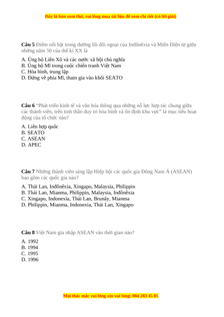 Câu 5 Điểm nổi bật trong đường lối đối ngoại của Inđônêxia và Miến Điện từ giữa