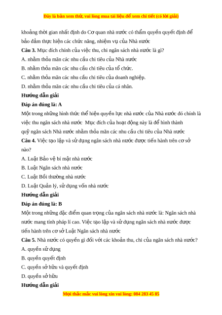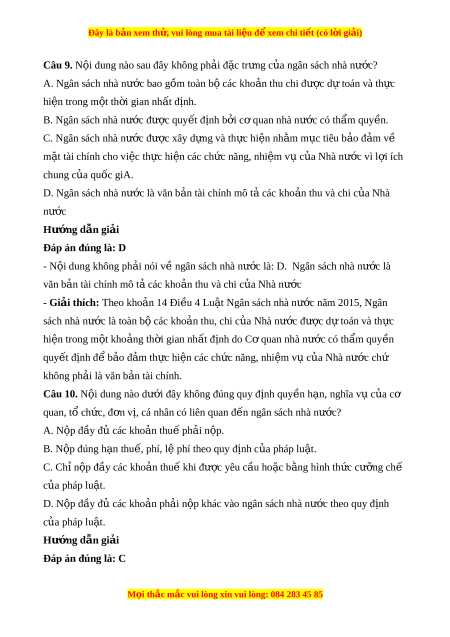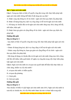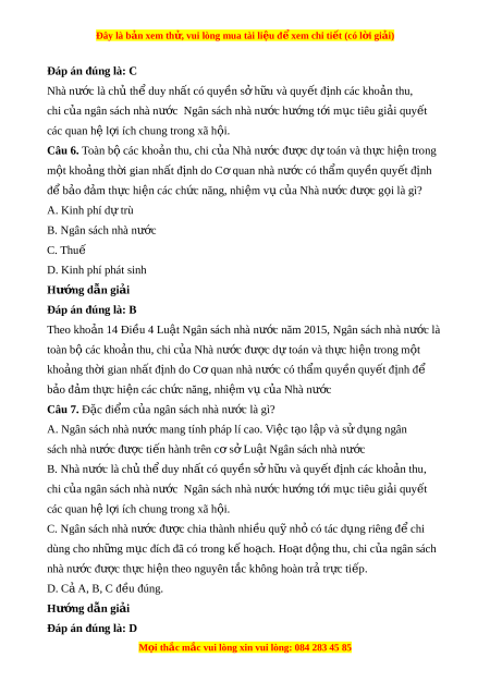 Đây là bản xem th , vu ử i lòng mua tài li u ệ đ xe ể m chi ti t ế (có l i ờ gi i ả ) Đáp án đúng là: C Nhà nư c l ớ à chủ thể duy nh t ấ có quy n ề s h ở u ữ và quy t ế đ nh các kho ị n ả thu, chi c a ủ ngân sách nhà nư c ớ Ngân sách nhà nư c h ớ ư ng ớ t i ớ m c t ụ iêu gi i ả quy t ế các quan hệ l i ợ ích chung trong xã h i ộ . Câu 6. Toàn b các ộ kho n t ả hu, chi c a ủ Nhà nư c ớ đư c d ợ ự toán và th c hi ự n t ệ rong m t ộ kho ng ả th i ờ gian nh t ấ đ nh do C ị quan nhà n ơ ư c có t ớ h m ẩ quy n quy ề t ế đ nh ị đ b ể o ả đ m ả th c ự hi n các ệ ch c năng, ứ nhi m ệ v c ụ a ủ Nhà nư c ớ đư c g ợ i ọ là gì? A. Kinh phí d t ự rù B. Ngân sách nhà nư c ớ C. Thuế D. Kinh phí phát sinh Hư ng d ớ ẫn gi i ả Đáp án đúng là: B Theo kho n 14 Đ ả i u ề 4 Lu t