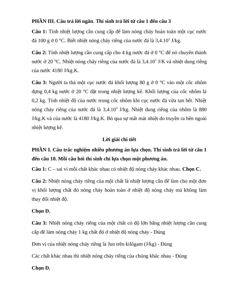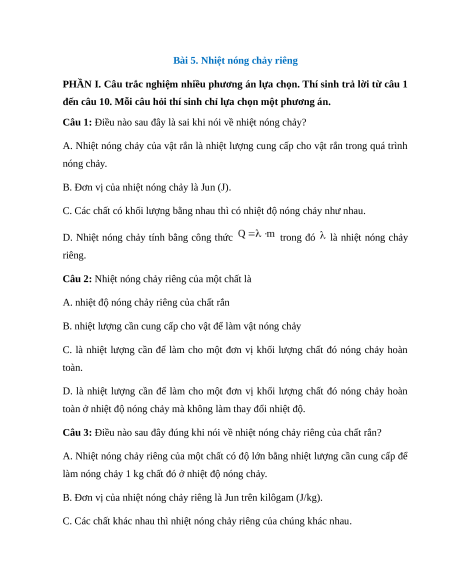 Câu 3: Điều nào sau đây đúng khi nói về nhiệt nóng chảy riêng của chất rắn?