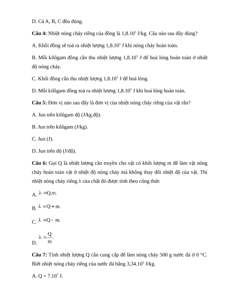 Câu 4: Nhiệt nóng chảy riêng của đồng là 1,8.105 J/kg. Câu nào sau đây đúng?