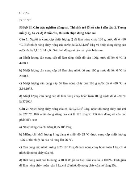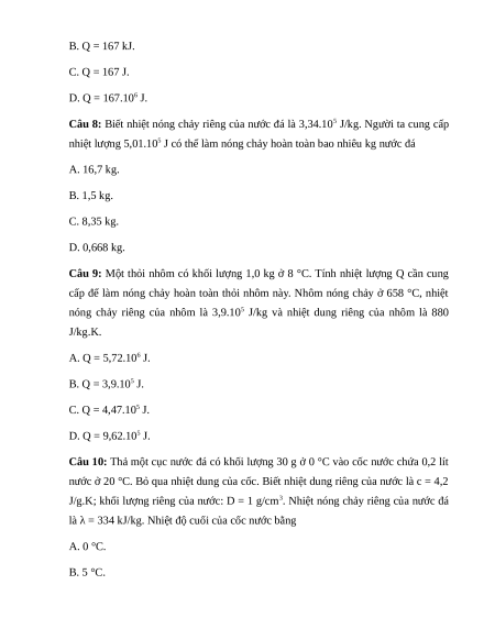 Câu 8: Biết nhiệt nóng chảy riêng của nước đá là 3,34.105 J/kg. Người ta cung cấp