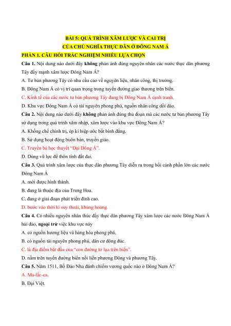 Câu 8. Từ giữa thế kỉ XVI đến đầu thế kỉ XX, nước nào ở Đông Nam Á đã trở thành thuộc địa