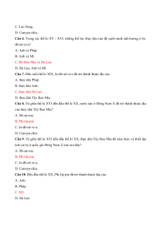 Câu 7. Đến cuối thế kỉ XIX, In-đô-nê-xi-a đã trở thành thuộc địa của A. thực dân Pháp. B. thực dân Anh. C. thực dân Hà Lan. D. thực dân Tây Ban Nha.