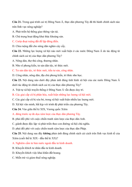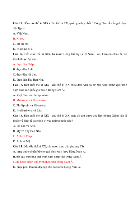 Câu 11. Đến cuối thế kỉ XIX - đầu thế kỉ XX, quốc gia duy nhất ở Đông Nam Á vẫn giữ được độc lập là A. Việt Nam. B. Xiêm. C. Mi-an-ma. D. In-đô-nê-xi-a.