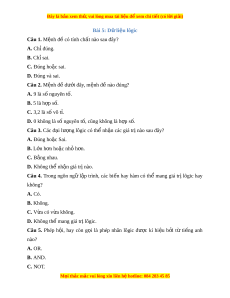 Đây là bản xem th , vu ử i lòng mua tài li u ệ đ xe ể m chi ti t (c ế ó l i ờ gi i ả ) Bài 5: D l ữ i u l ệ ôgic Câu 1. Mệnh đ có t ề ính ch t ấ nào sau đây? A. Chỉ đúng. B. Chỉ sai. C. Đúng hoặc sai. D. Đúng và sai. Câu 2. Mệnh đ d ề ư i ớ đây, m nh đ ệ nào đúng? ề