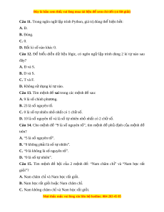 D. 0 không là số nguyên tố, cũng không là h p s ợ . ố Câu 3. Các đ i ạ lư ng ợ lôgic có th nh ể n ậ các giá tr nào ị sau đây? A. Đúng hoặc Sai. B. L n h ớ n ho ơ c nh ặ ỏ h n. ơ C. B ng nhau. ằ D. Không th nh ể n ậ giá tr nào. ị