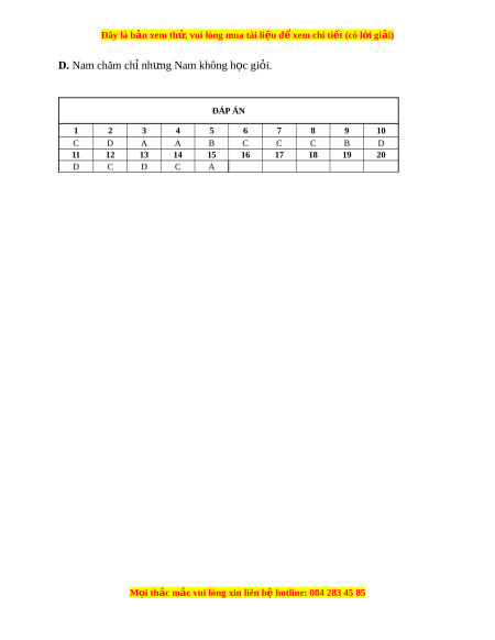 Đây là bản xem th , vu ử i lòng mua tài li u ệ đ xe ể m chi ti t (c ế ó l i ờ gi i ả ) D. Nam chăm ch nh ỉ ng N ư am không h c gi ọ i ỏ . ĐÁP ÁN 1 2 3 4 5 6 7 8 9 10 C D A A B C C C B D 11 12 13 14 15 16 17 18 19 20 D C D C A M i