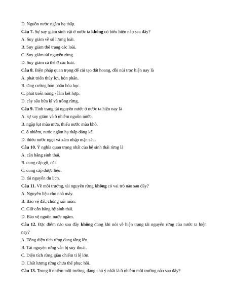 Câu 5. Nguyên nhân làm thu hẹp diện tích rừng, làm nghèo tính đa dạng và nguồn gen chủ yếu do A. các loại dịch bệnh. B. chiến tranh tàn phá. C. khai thác quá mức. D. cháy rừng, thiên tai.