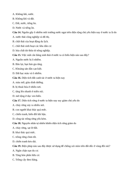 Câu 13. Trong ô nhiễm môi trường, đáng chú ý nhất là ô nhiễm môi trường nào sau đây? A. Không khí, nước. B. Không khí và đất.