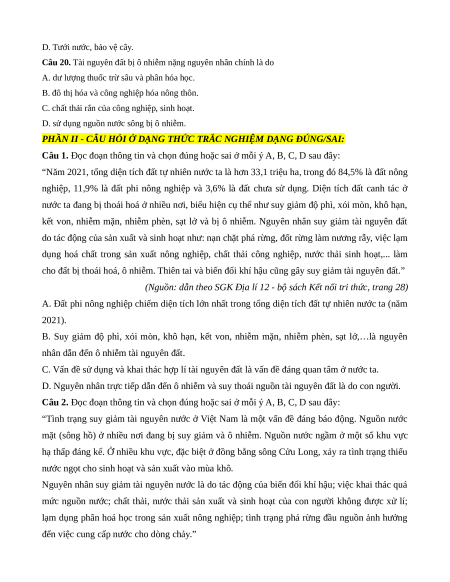 Trắc nghiệm Bài 5: Vấn đề sử dụng hợp lí tài nguyên thiên nhiên và bảo vệ môi trường Địa lí 12 Đúng-Sai, Trả lời ngắn sách mới 2025