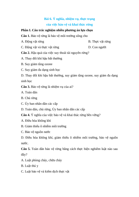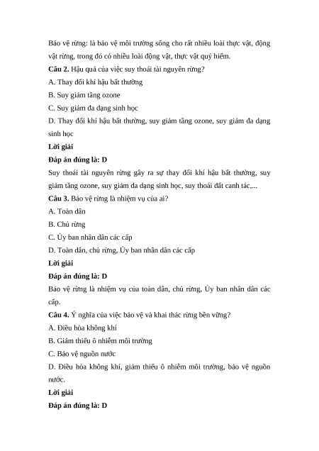 Câu 1. Bảo vệ rừng là bảo vệ môi trường sống cho A. Động vật rừng B. Thực vật rừng