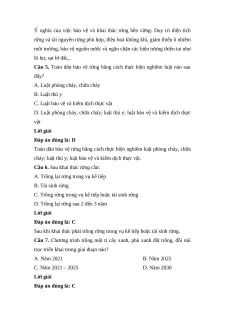 Câu 4. Ý nghĩa của việc bảo vệ và khai thác rừng bền vững? A. Điều hòa không khí