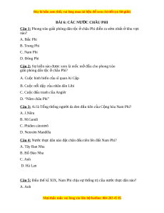 Câu 1: Phong trào gi i ả phóng dân t c ộ châu Phi ở di n r ễ a s m ớ nh t ấ khu v ở c ự nào? A. B c Phi ắ B. Trung Phi C. Nam Phi D. Đông Phi Câu 2: S ki ự ện nào đư c ợ xem là mốc m đ ở u cho phong t ầ rào gi i ả phóng dân t c ộ châu Phi ở ? A. Cu c ộ binh bi n c ế a s ủ ĩ quan Ai C p ậ B. Cuộc nổi d y c ậ a ủ nhân dân Libi C. Cu c ộ đ u t ấ ranh c a ủ Angiêr D. “Năm châu Phi”
