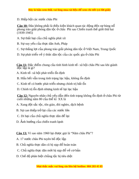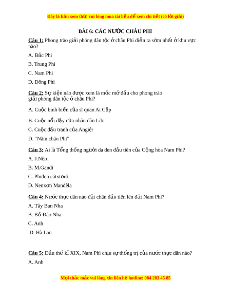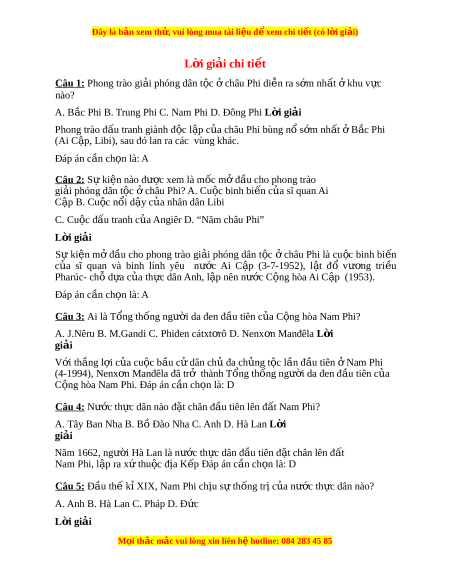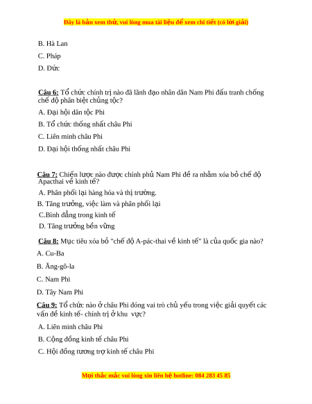Đây là bản xem th , vu ử i lòng mua tài li u ệ đ xe ể m chi ti t (c ế ó l i ờ gi i ả ) B. Hà Lan C. Pháp D. Đ c ứ Câu 6: T ch ổ c ứ chính tr nào đã ị lãnh đ o nhân dân ạ Nam Phi đ u t ấ ranh ch ng ố ch đ ế phân ộ biệt ch ng ủ t c? ộ A. Đ i ạ h i ộ dân t c Phi ộ B. Tổ ch c t ứ hống nhất châu Phi C. Liên minh châu Phi D. Đ i ạ h i ộ th ng nh ố t ấ châu Phi Câu 7: Chi n ế lư c nào đ ợ ược chính ph N ủ am Phi đ r ề a nh m ằ xóa b ch ỏ đ ế ộ Apacthai v ki ề nh t ? ế A. Phân phối l i ạ hàng hóa và th t ị rư ng. ờ B. Tăng trư ng, vi ở c l ệ àm và phân ph i ố l i ạ C.Bình đ ng t ẳ rong kinh tế D. Tăng trư ng b ở n v ề ng ữ