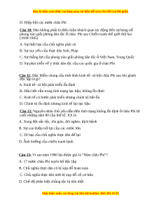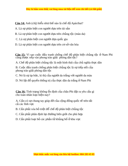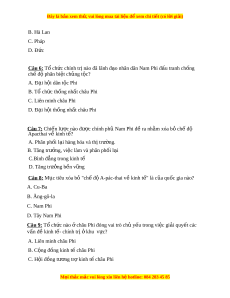 Câu 14: Anh (chị) hi u nh ể t ư h nào l ế à ch đ ế ộ Apácthai? A. Là sự phân bi t ệ con ngư i ờ d a t ự rên tài s n ả B. Là s phân bi ự t ệ con ngư i ờ d a ự trên ch ng ủ t c ( ộ màu da) C. Là s phân bi ự t ệ con ngư i ờ d a ự qu c ố gia D. Là sự phân bi t ệ con ngư i ờ d a t ự rên c s ơ văn hóa ở Câu 15: Vì sao cu c ộ đ u ấ tranh ch ng ố chế độ phân bi t ệ ch ng ủ t c ộ ở Nam Phi cũng đư c ợ x p vào phong t ế rào gi i ả phóng dân t c? ộ A. Ch đ ế ộ phân bi t ệ ch ng t ủ c l ộ à m t ộ hình thái c a ủ ch nghĩ ủ a th c dân ự B. Cu c ộ đ u t ấ ranh ch ng phân bi ố t ệ ch ng t ủ c l ộ à s t ự i p n ế i ố c a ủ phong trào gi i ả phóng dân t c ộ C. Nó là sự áp b c, kì ứ th c ị a ng ủ ư i ờ da tr ng ắ v i ớ ngư i ờ da màu D. Nó l t ậ đổ quy n t ề h ng t ố r c ị a t ủ h c ự dân da tr ng ắ N ở am Phi Câu 16: Tình tr ng ạ không n đ ổ nh c ị a ủ châu Phi đ t ặ ra yêu c u gì ầ cho toàn nhân lo i ạ hi n nay? ệ