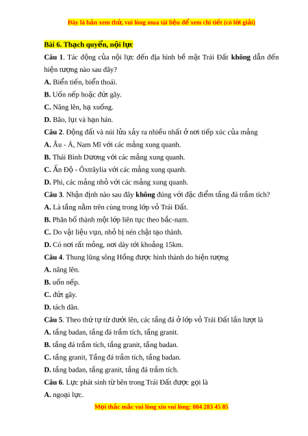 ạ thành.Câu 10. Cấu t o ạ c a ủ l p ớ vỏ l c đ ụ a và v ị đ ỏ i ạ dư ng có đi ơ m ể khác nhau c b ơ n ả là A. vỏ đ i ạ dư ng ơ c u ấ t o ạ chủ y u ế b ng ằ tr m ầ tích, vỏ l c ụ đ a ị chủ y u ế là badan. B. l p v ớ l ỏ c đ ụ ịa m ng ỏ h n l ơ p v ớ đ ỏ i ạ dư ng nh ơ ng có t ư hêm t ng đá gr ầ anit. C. l p v ớ ỏ đ i ạ dư ng ơ chi m ế di n t ệ ích l n ớ và phân b r ố ng h ộ n ơ l p v ớ l ỏ c đ ụ a. ị D. vỏ đ i ạ dư ng ơ c u ấ t o ạ chủ y u ế b ng ằ badan, vỏ l c ụ đ a ị chủ y u ế b ng ằ granit.Câu 11. Đ c ặ đi m ể c a v ủ n ậ đ ng t ộ heo phư ng t ơ h ng ẳ đ ng l ứ à A. x y ả ra rất ch m ậ trên m t ộ di n t ệ ích nh . ỏ B. x y r ả a r t ấ ch m ậ trên m t ộ di n t ệ ích l n. ớ M i ọ thắc m c