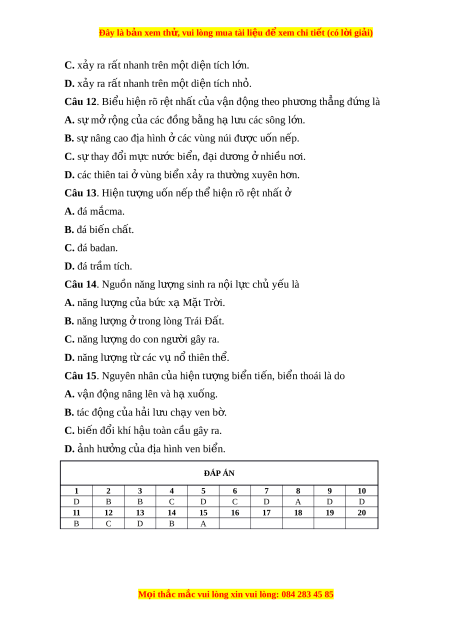Câu 15. Nguyên nhân c a ủ hiện tư ng ợ bi n t ể i n, bi ế n t ể hoái là do A. v n đ ậ ng ộ nâng lên và h xu ạ ống. B. tác đ ng c ộ a h ủ i ả l u ch ư y ven ạ b . ờ C. bi n đ ế i ổ khí h u ậ toàn c u gây r ầ a. D. nh h ả ư ng ở c a đ ủ ịa hình ven bi n. ể ĐÁP ÁN 1 2 3 4 5 6 7 8 9 10 D B B C D C D A D D 11 12 13 14 15 16 17 18 19 20 B C D B A M i