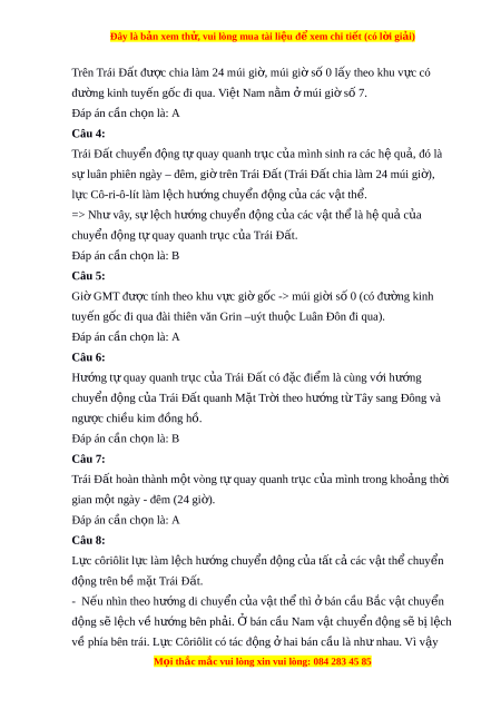 Đây là bản xem th , vu ử i lòng mua tài li u ệ đ xe ể m chi ti t ế (có l i ờ gi i ả ) Trên Trái Đ t ấ đư c chi ợ a làm 24 múi gi , m ờ úi gi s ờ ố 0 l y t ấ heo khu v c ự có đư ng ki ờ nh tuy n g ế ốc đi qua. Vi t ệ Nam n m ằ m ở úi gi s ờ 7. ố Đáp án cần ch n ọ là: A Câu 4: Trái Đất chuy n đ ể ng t ộ quay ự quanh tr c ụ c a m ủ ình sinh ra các h qu ệ , ả đó là s l