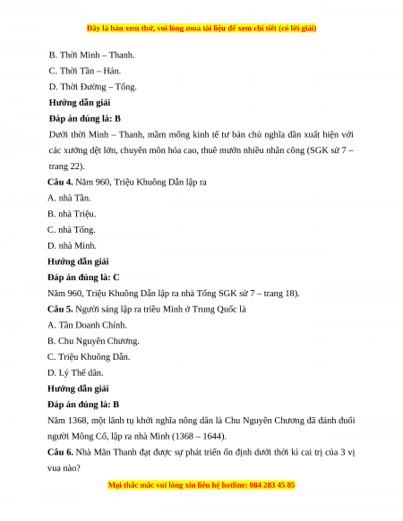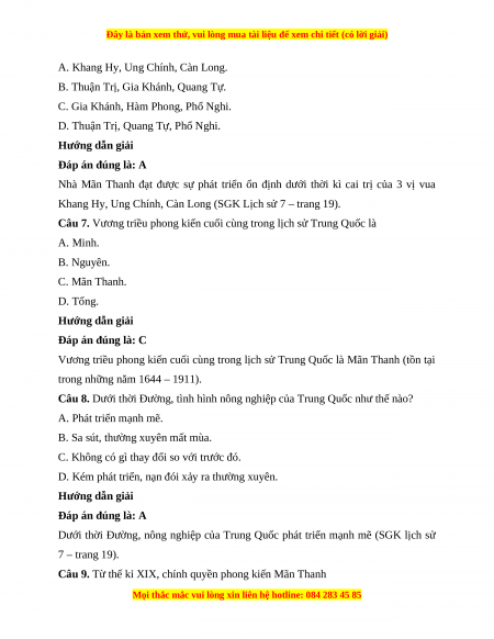 Câu 7. Vương triều phong kiến cuối cùng trong lịch sử Trung Quốc là A. Minh. B. Nguyên. C. Mãn Thanh. D. Tống. Hướng dẫn giải Đáp án đúng là: C