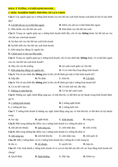 Câu 7: Ý tưởng kinh doanh là những suy nghĩ, hành động sáng tạo, có tính khả thi, có thể đem lại lợi nhuận trong A. học tập. B. nghệ thuật. C. kinh doanh. D. công tác.