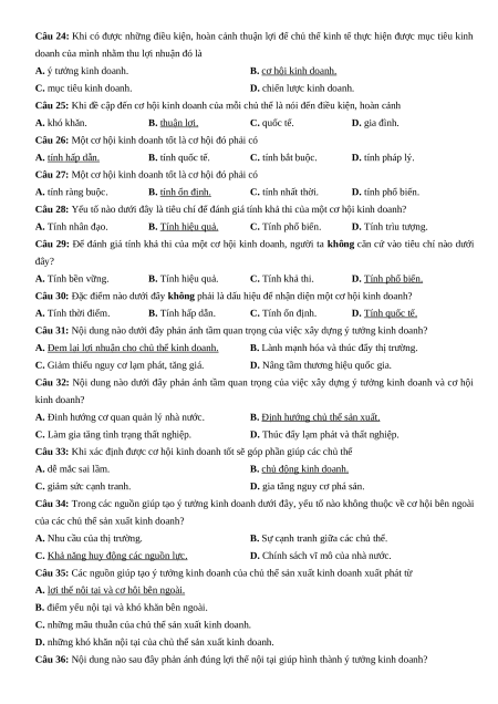 Câu 25: Khi đề cập đến cơ hội kinh doanh của mỗi chủ thể là nói đến điều kiện, hoàn cảnh A. khó khăn. B. thuận lợi. C. quốc tế. D. gia đình.