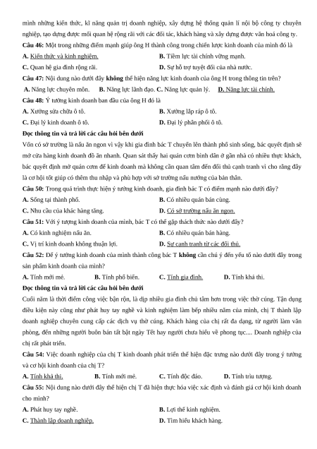 Câu 42: Tính sáng tạo trong ý tưởng kinh doanh của chị D thể hiện ở việc, ý tưởng của chị D mang tính A. trùng lặp. B. phổ biến. C. độc đáo. D. phổ quát.