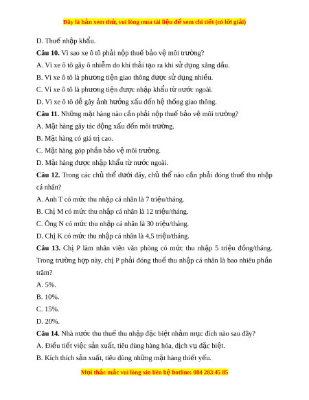 Câu 10. Vì sao xe ô tô ph i ả n p ộ thu b ế o v ả m ệ ôi trư ng ờ ? A. Vì xe ô tô gây ô nhi m ễ do khí th i ả t o ạ ra khi s d ử ng xăng d ụ u. ầ B. Vì xe ô tô là phư ng ơ ti n gi ệ ao thông đư c s ợ d ử ng nhi ụ u. ề C. Vì xe ô tô là phư ng ơ ti n đ ệ ư c nh ợ p ậ kh u t ẩ n ừ ư c ớ ngoài. D. Vì xe ô tô d gây ễ nh ả hư ng x ở u đ ấ n h ế t ệ h ng g ố iao thông. Câu 11. Nh ng ữ m t ặ hàng nào c n ph ầ i ả n p t ộ hu b ế o v ả m ệ ôi trư ng? ờ A. M t ặ hàng gây tác đ ng x ộ u đ ấ n m ế ôi trư ng. ờ B. M t ặ hàng có giá tr cao. ị C. M t ặ hàng góp ph n b ầ o v ả m ệ ôi trư ng. ờ D. M t ặ hàng được nh p ậ kh u t ẩ n ừ ư c ớ ngoài.